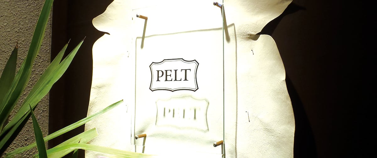 PELTとは毛皮或いは生皮、鞣す前の原皮を指す言葉。Pelt(皮)を鞣すことでLeather(革)へと変化します。またロゴマークの文字を囲むフレームは国際的に使用されている、天然皮革製品であることを示す「レザーマーク」をアレンジしたもの。つまりただ “皮・革” であるという意味だけを表した名前です。このロゴは余計なものを廃し、革という素材から純粋にその魅力だけを抽出したものを作るということを意図しています。