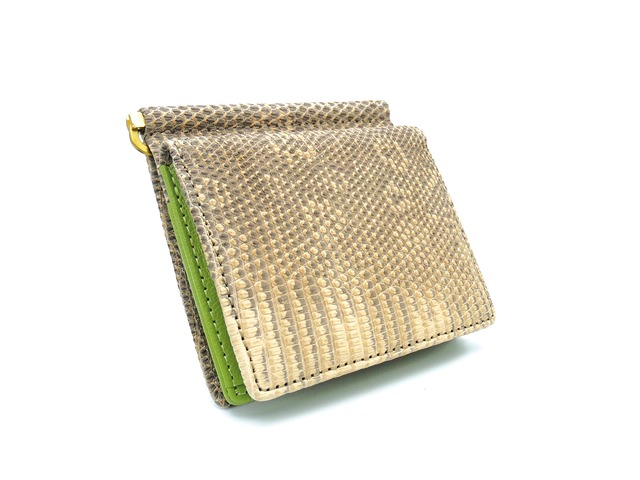 表:リザード(トカゲ革)/ナチュラル 中:ゴート(ヤギ革)/アップルグリーン H:約10.0cm W:約9.5cm(開時約16.5cm) カードポケット:7 小銭入れ:1 外側に小銭入れが付いたビルクリップ(札バサミ)タイプのコンパクトなお財布。カードポケットは小銭れの下にもあり、計7枚分の収納。左利きの方には札バサミの金具をゆっくりと引き抜き、反対側に差し替えてもお使いいただけます。 細かなウロコ模様が美しいリザード(トカゲ革)。肌模様が残る生成りの仕上げはより野性味があると同時に、リザードならではの上品さも合わせ持ちます。とても丈夫な素材のため、エキゾティックレザー用のクリームなどでケアしながら丁寧に使っていくと、より深みのある色になり、自然なツヤを帯びていきます。 内側には鮮やかなアップルグリーンのゴートとの組み合わせ。つるつるとなめらかで肌触りも良く、ヤギ革特有のシワ模様と丈夫さを備えています。顔料仕上げのため革用のクリーナーなどを使用でき、比較的綺麗な状態を保ちやすい革です。 Pay IDアプリでご覧のお客様へ PELTについて( https://pelt.base.shop/ ) ○ご希望の革の組み合わせでのメールオーダーも承っております。お気軽にお問い合わせください。 ○こちらの商品は店頭でも販売しております。ご注文のタイミングによっては既に売り切れている可能性がありますので予めご了承ください。 ○閲覧環境によって画像と実際の色は多少異なる場合があります。予めご了承ください。 ○皮革は天然素材のため原皮自体の傷、色むら等がある場合があります。弊店の製品には意図的にそうした皮革を使用したものがあります。品質には問題ありませんので予めご了承ください。 ○保管の際は付属の箱に入れず、非常な高温・低温、多湿、直射日光を避け、風通しの良い場所に置いてください。 ○全ての商品はメンテナンスや修理も承っております。ご購入後もお気軽にご相談ください。