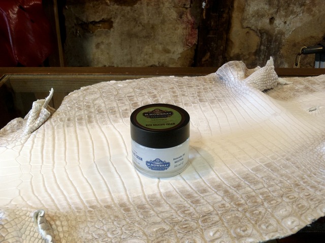 M.モゥブレィのリッチデリケートクリーム(50ml)。 アボカドオイルなど、主成分の97%が天然成分でできたクリームです。 ジェル状で伸びが良いので使いやすく、高い浸透性を持ちながらヌメ革など明るい色の革に使っても色が変わりにくいのが特徴です。 乾燥した革に潤いを与え硬化を和らげますので、革小物の折れ曲がる部分のひび割れを防ぐことができます。 既に乾燥してしまった革の栄養補給から、革小物や靴など革製品全般の日頃のお手入れに。 ブラシなどで革製品のホコリや汚れを落としてから少しずつ革に塗り込み、柔らかな布で拭き上げます。 ツヤを出したい場合には更にその上からロウ分を多く含んだアニリンカーフクリーム( https://pelt.base.shop/items/116490900 )を薄く塗って豚毛ブラシでブラッシングし、ポリッシングクロスで仕上げるのがおすすめです。 Pay IDアプリでご覧のお客様へ PELTについて( https://pelt.base.shop/ ) ○ご希望の革の組み合わせでのメールオーダーも承っております。お気軽にお問い合わせください。 ○こちらの商品は店頭でも販売しております。ご注文のタイミングによっては既に売り切れている可能性がありますので予めご了承ください。 ○閲覧環境によって画像と実際の色は多少異なる場合があります。予めご了承ください。 ○全ての商品はメンテナンスや修理も承っております。ご購入後もお気軽にご相談ください。
