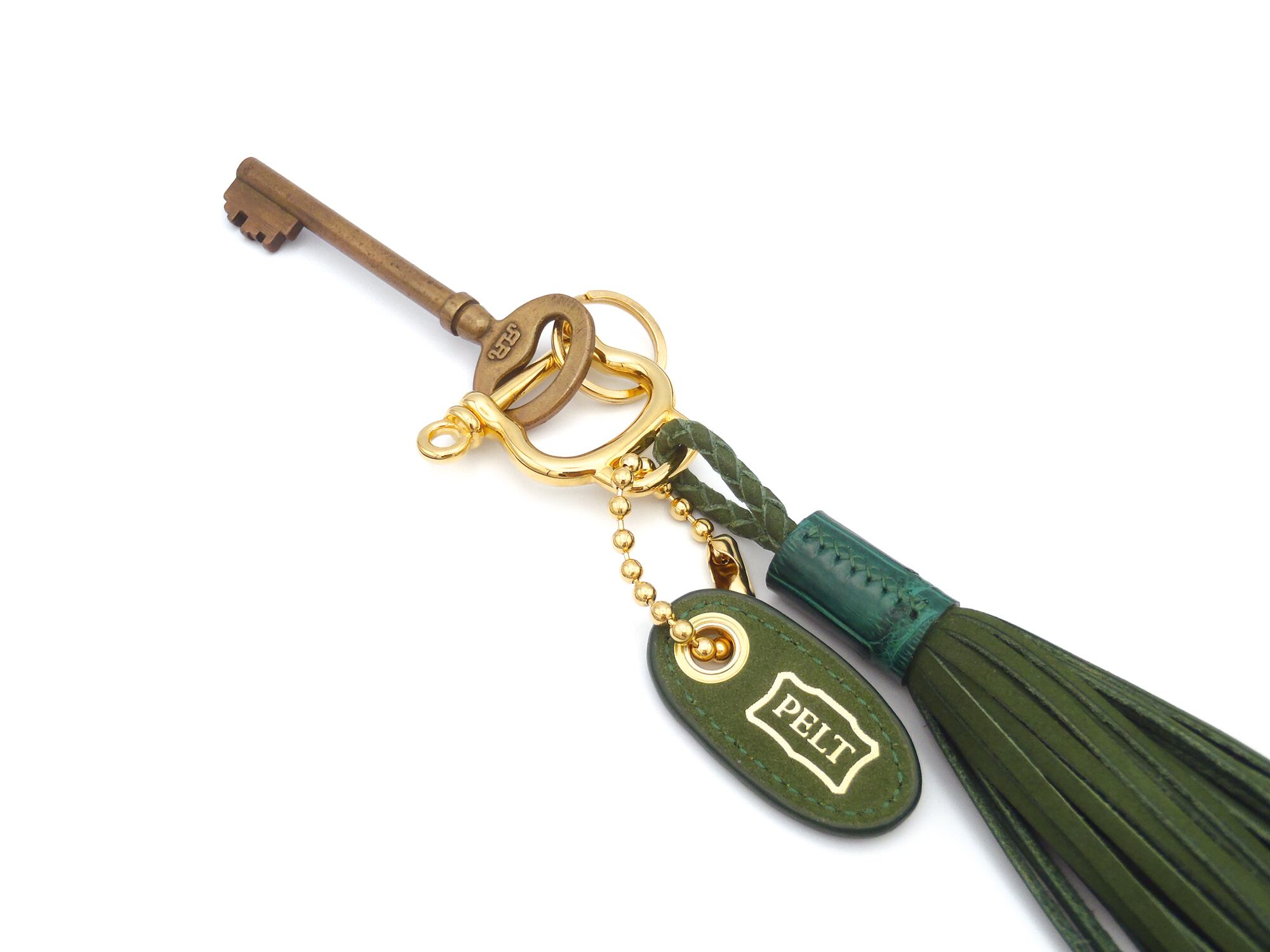 タッセルが軽やかに揺れるキーリング。シャックル型の金具でネジになっておりますので、回して開けて鍵を入れます(※画像3枚目は鍵を付けたイメージです。アンティークキーは付属しません)。ネジ棒に通らない鍵は二重リングをお使いください。