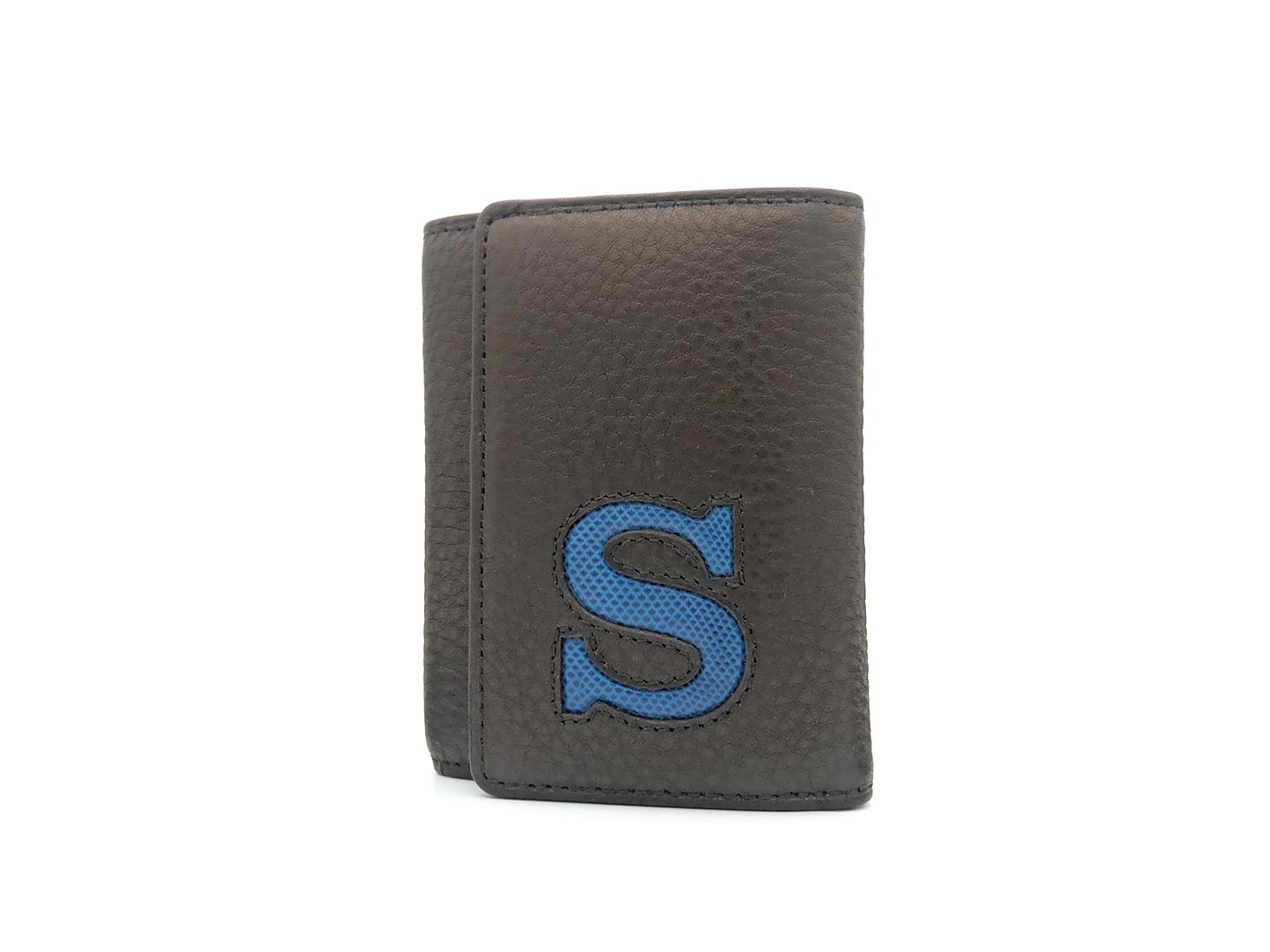 表側には革のインレイ(象嵌細工)によるアルファベットの “S” をアクセントに。Sの字には細かな鱗が特徴的なヤスリヘビの革を使用し、ただ牛革をくり抜いて裏からヤスリヘビの革を出すだけではなく、へこまないよう文字をぷっくりと膨らませる技術を用いています。