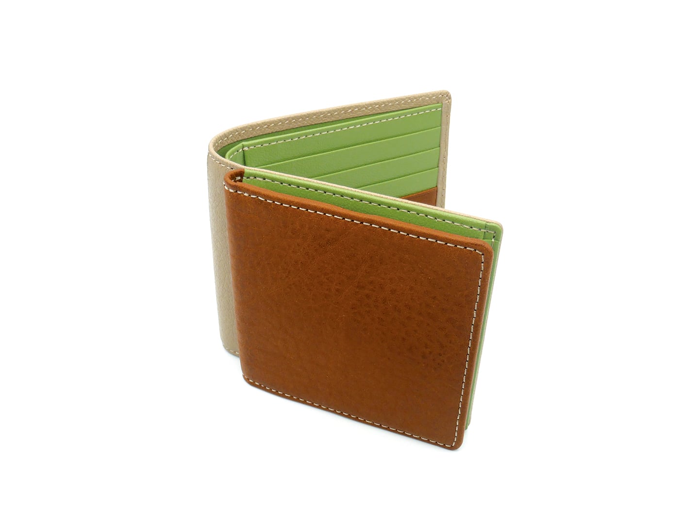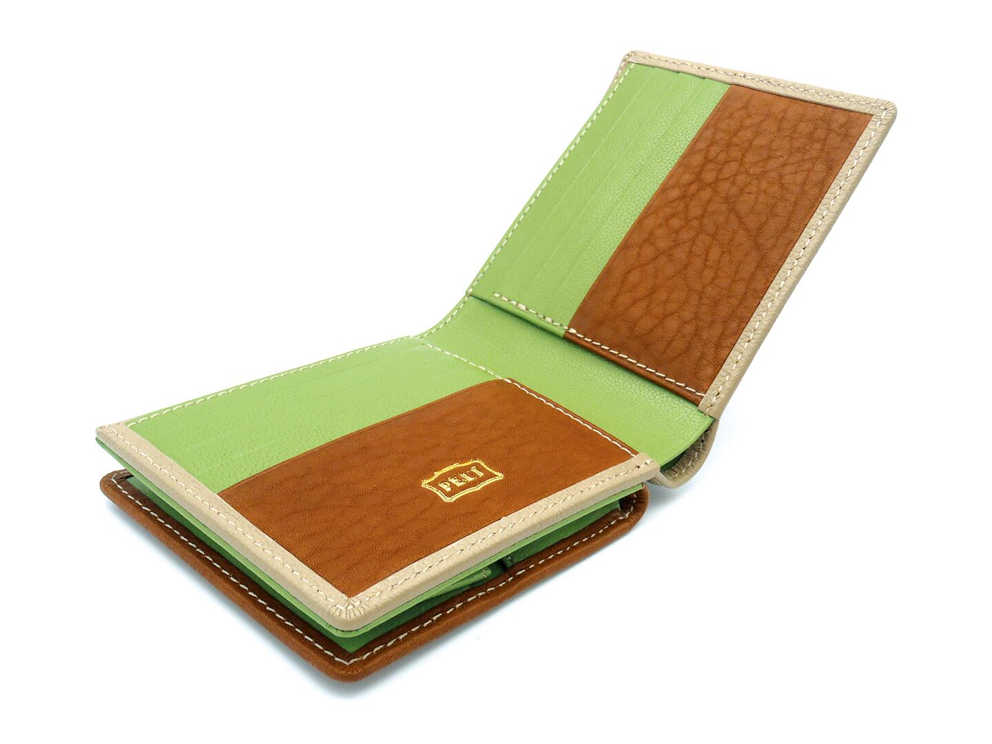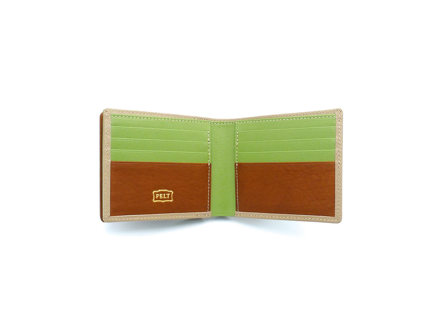 内側には鮮やかなアップルグリーンのゴートでアクセントを。つるつるとなめらかで肌触りも良く、こちらもヤギ革特有のシワ模様と丈夫さを備えています。顔料仕上げのため革用のクリーナーなどを使用でき、比較的綺麗な状態を保ちやすい革です。