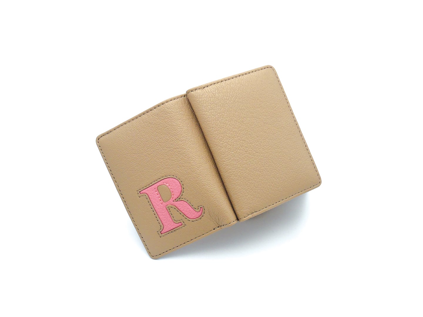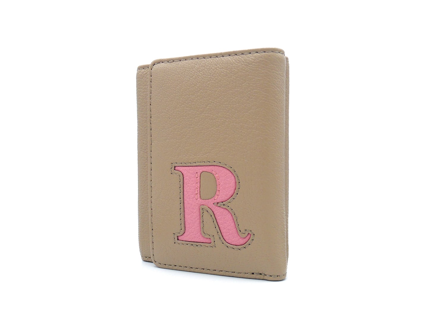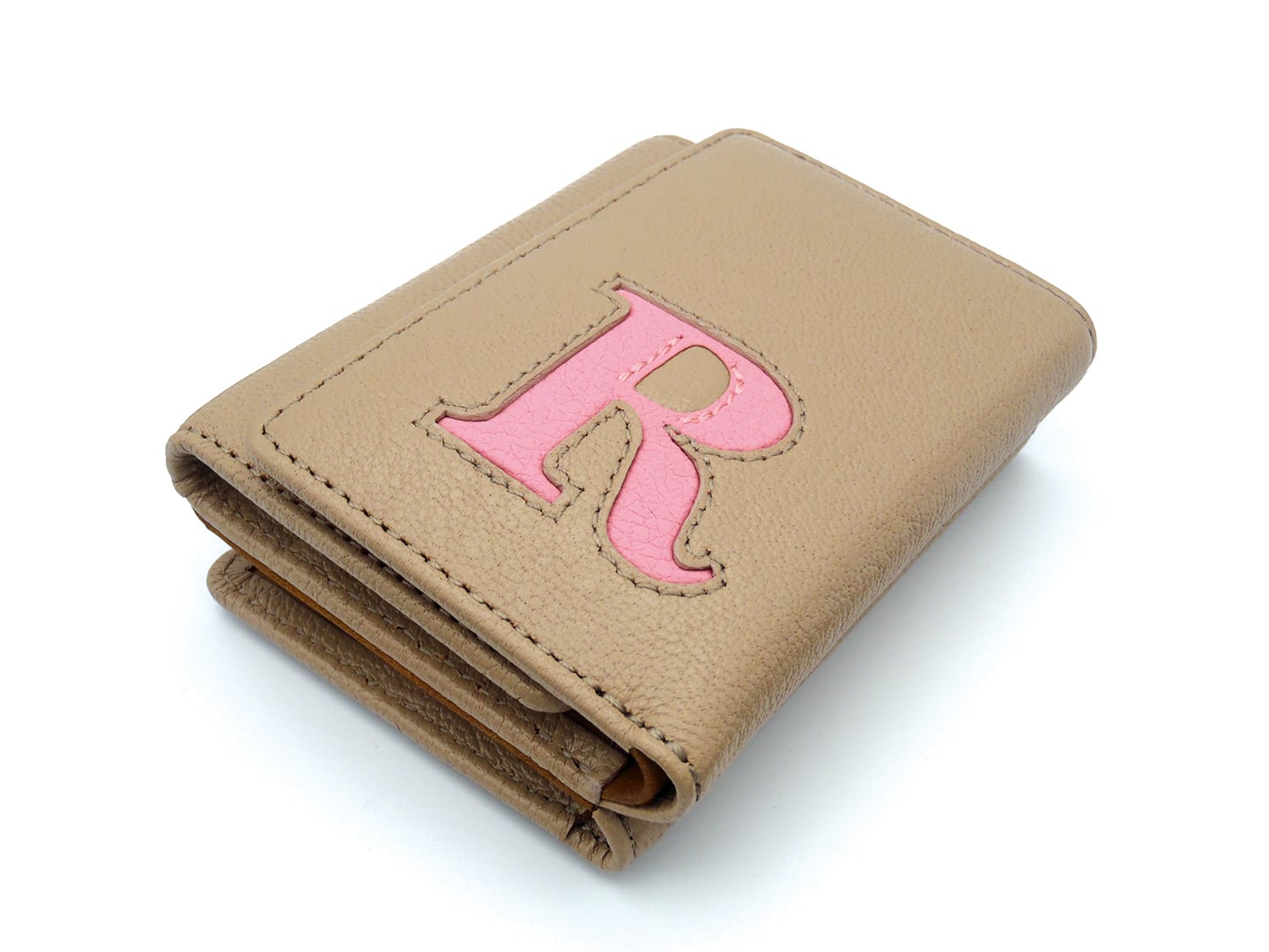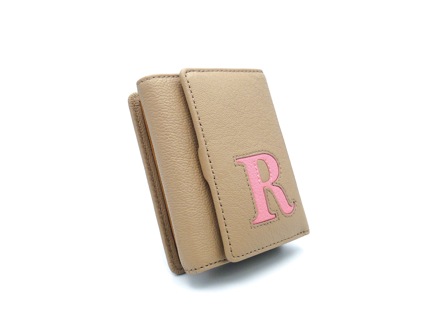 また、表側には革のインレイ(象嵌細工)によるアルファベットの “R” をアクセントに。Rの文字にはこちらも美しいシボが特徴のシュランケンカーフを使用し、ただゴートを切り抜いて裏からカーフを出すだけではなく、へこまないよう文字をぷっくりと膨らませる技術を用いています。
