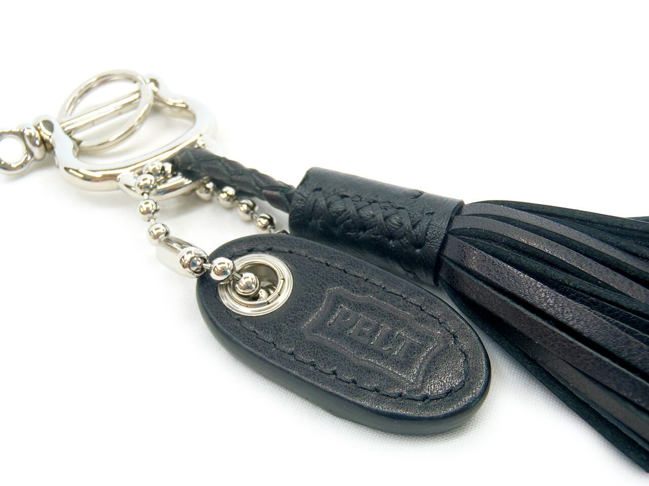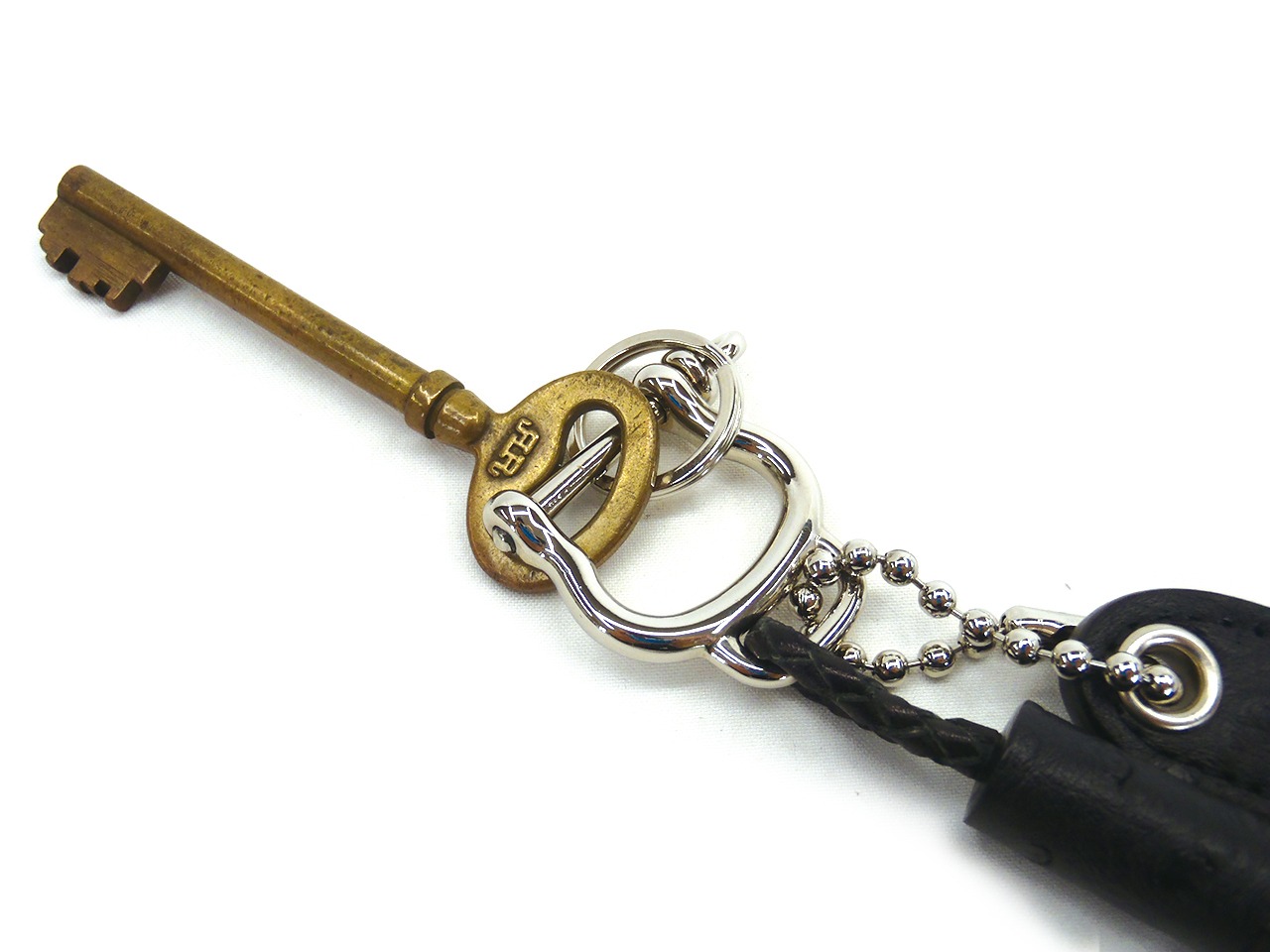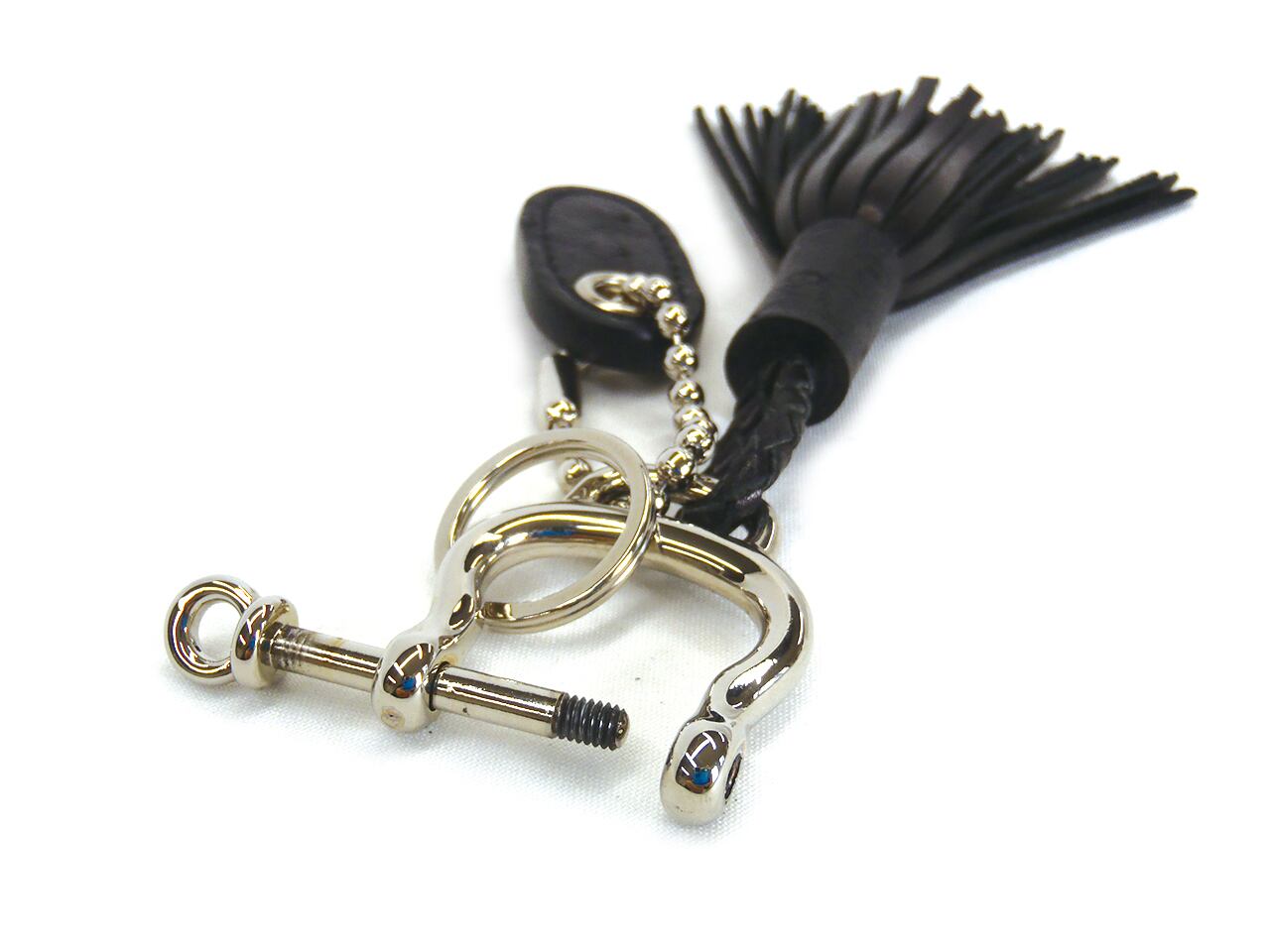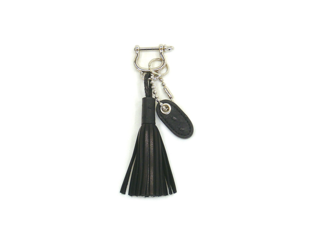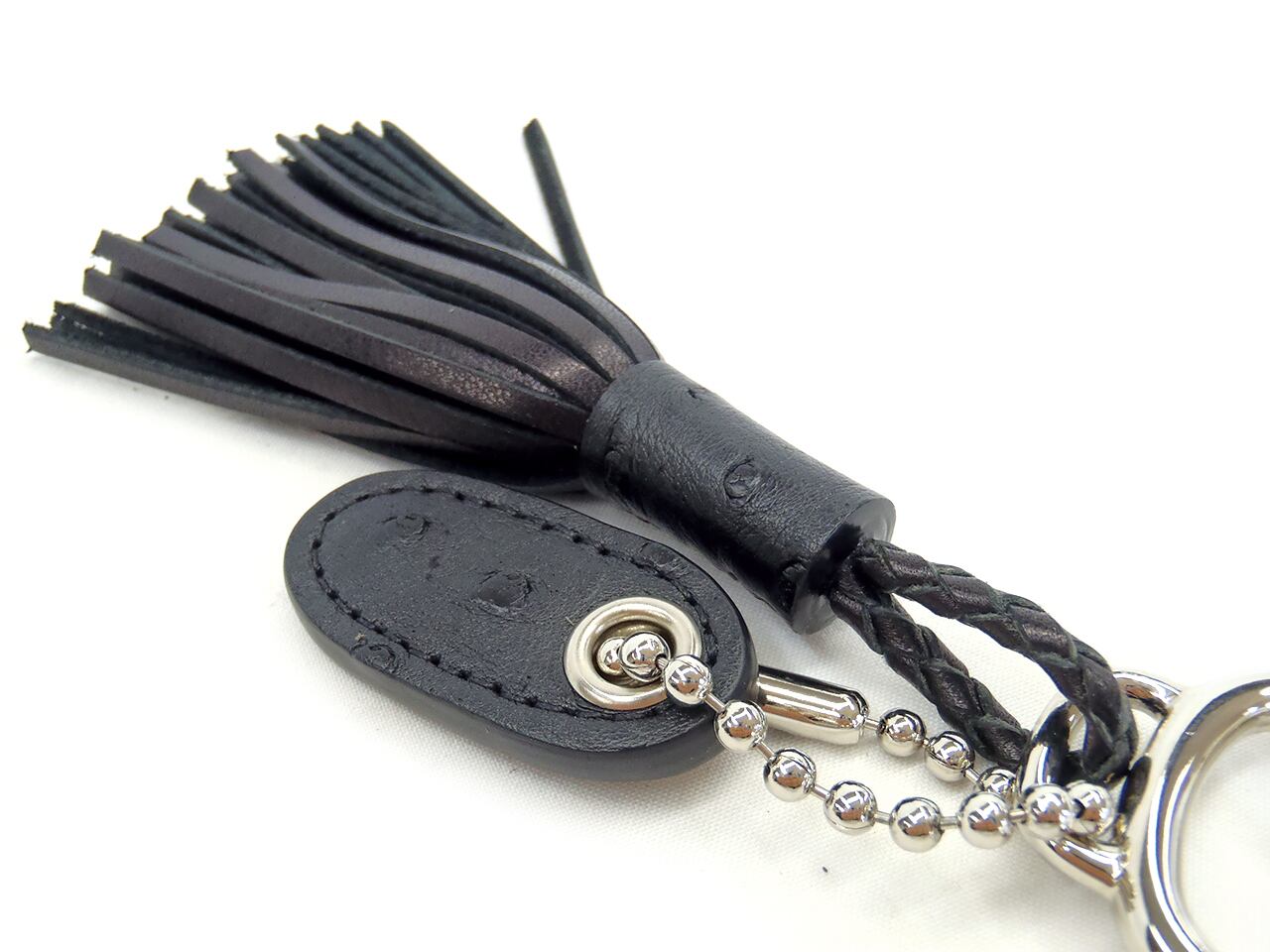 タッセルが軽やかに揺れるキーリング。シャックル型の金具でネジになっておりますので、回して開けて鍵を入れます(※アンティークキーは付属しません)。ネジ棒に通らない鍵は二重リングをお使いください。なめらかな肌触りの牛革に同色のオーストリッチがアクセント。