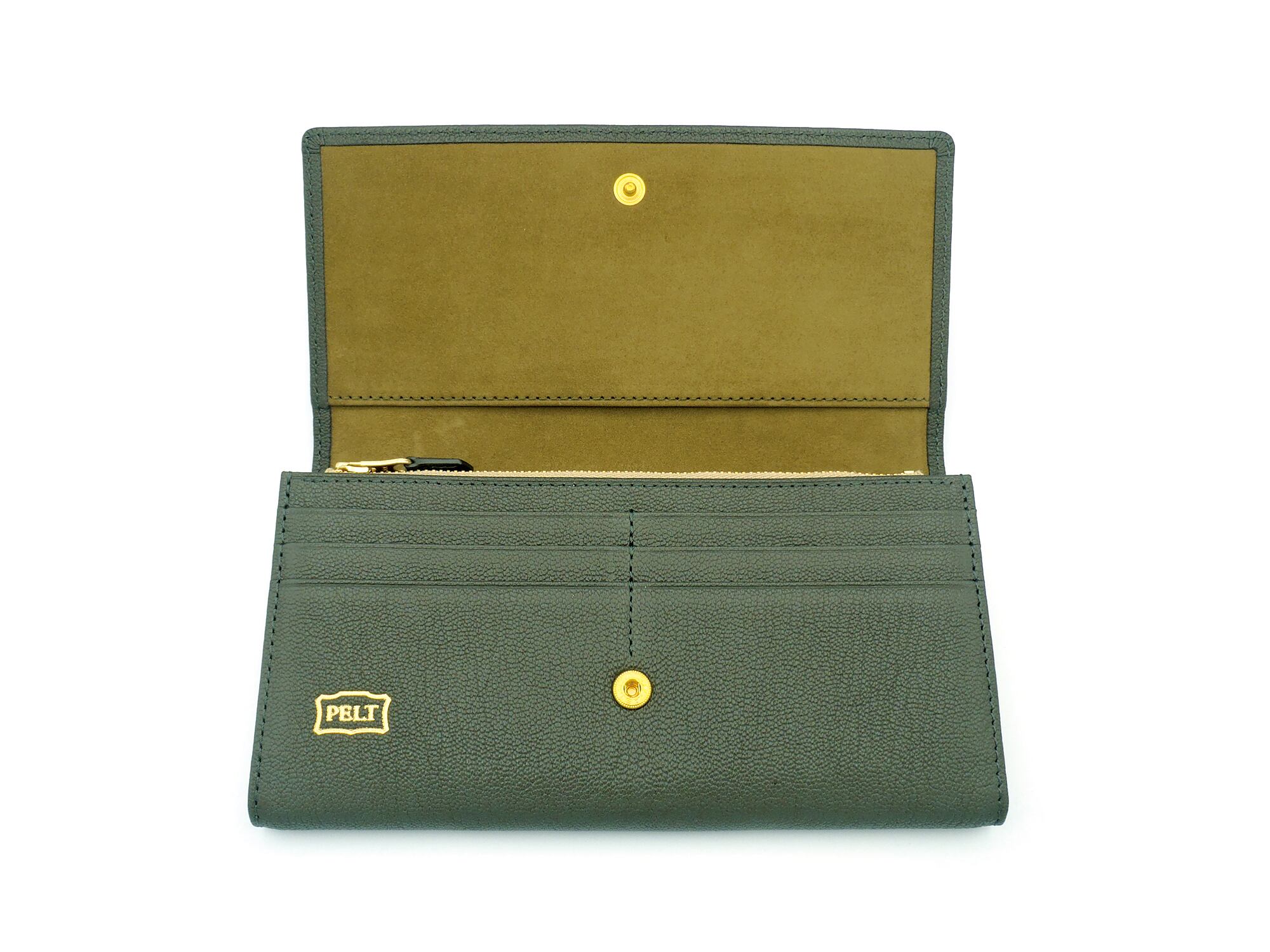 オリーブグリーンのヤギ革は凹凸のあるシボ(シワ模様)で表情豊か。柔らかな感触ながら銀面は強く、比較的丈夫な革です。
