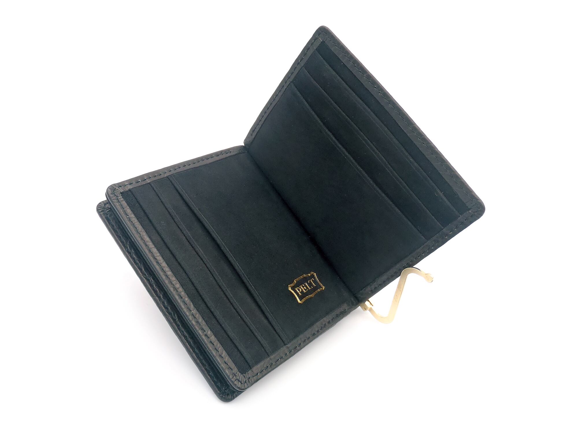 外側に小銭入れが付いたビルクリップ(札バサミ)タイプのコンパクトなお財布。カードポケットは小銭れの下にもあり、計7枚分の収納。左利きの方には札バサミの金具をゆっくりと引き抜き、反対側に差し替えてもお使いいただけます。