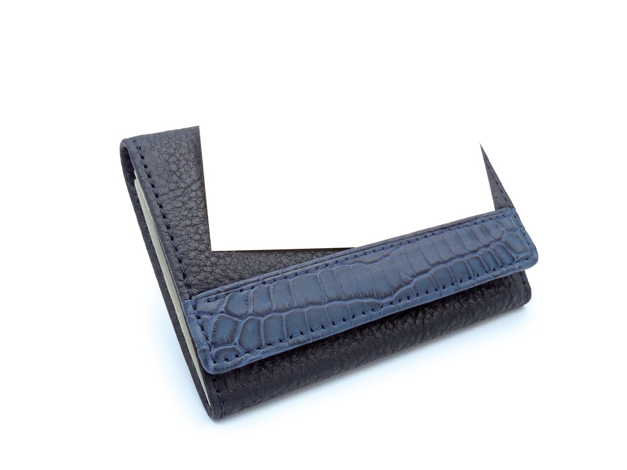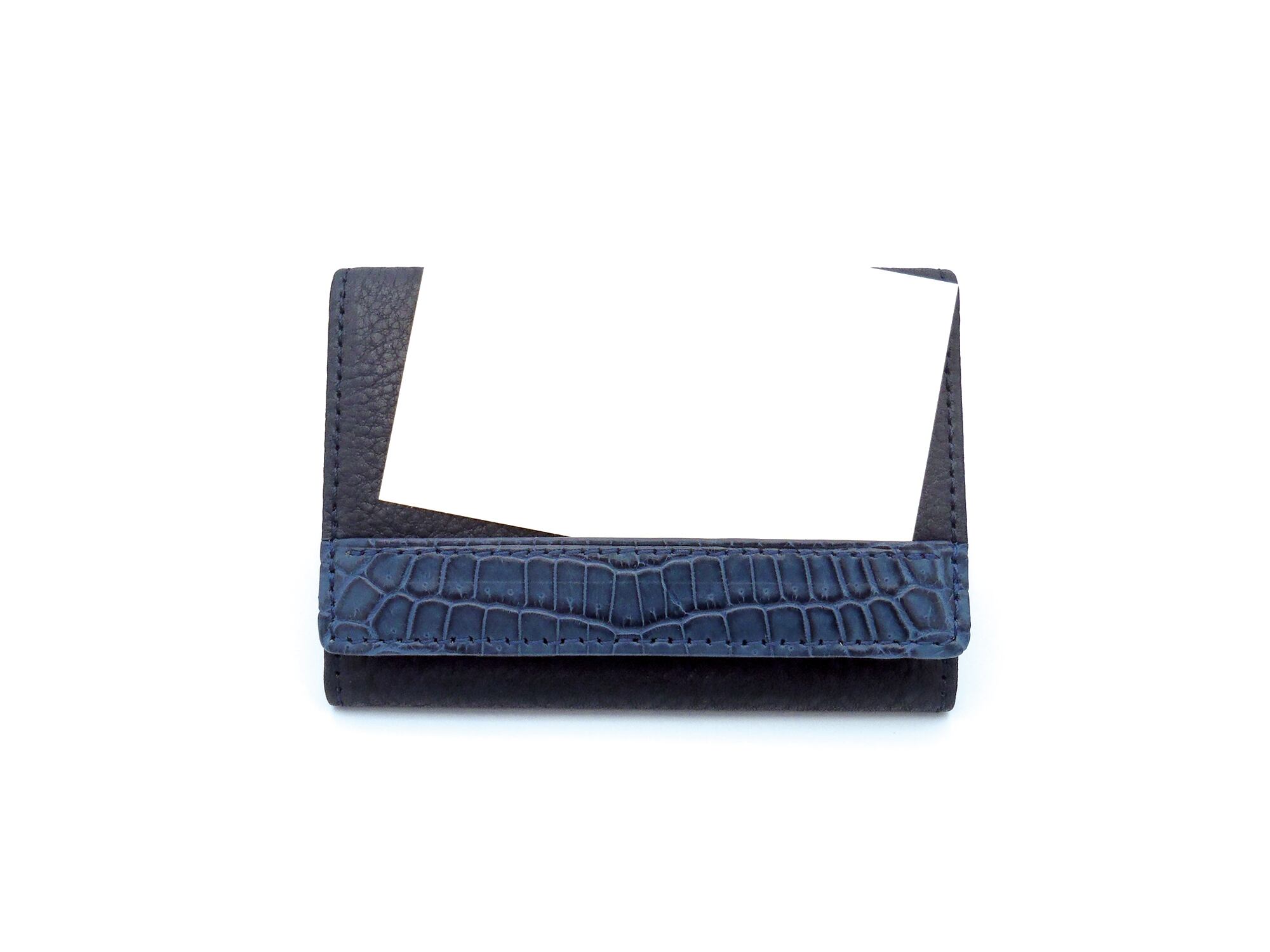 一般的にV字型のものが多い両サイドのマチをW字型にすることで大きく開いて一枚ずつ取り出しやすく、たくさん入れても納まりのいいシンプルな名刺ケース。