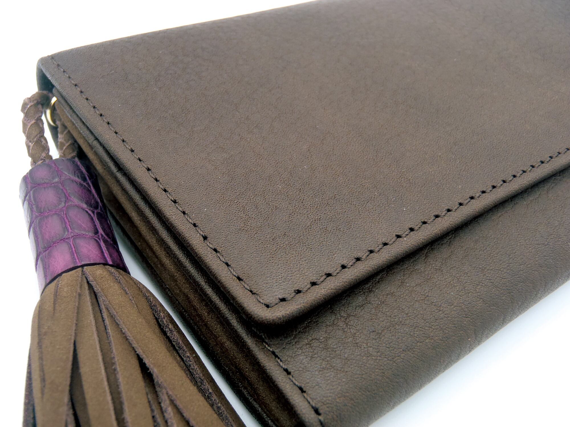 内側は肌触りの良い牛ヌバック、タッセルにはグレープカラーのアリゲーターでそれぞれに異なる素材感の組み合わせです。