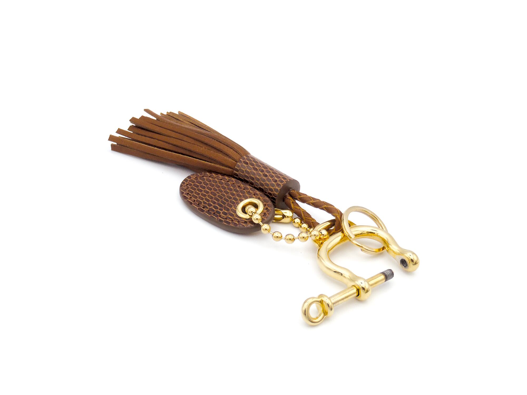 タッセルが軽やかに揺れるキーリング。シャックル型の金具でネジになっておりますので、回して開けて鍵を入れます(※画像3枚目は鍵を付けたイメージです。アンティークキーは付属しません)。ネジ棒に通らない鍵は二重リングをお使いください。