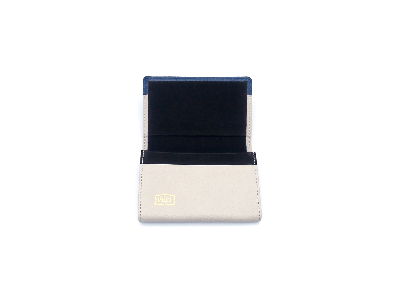 一般的にV字型のものが多い両サイドのマチをW字型にすることで大きく開いて一枚ずつ取り出しやすく、たくさん入れても納まりのいいシンプルな名刺ケース。