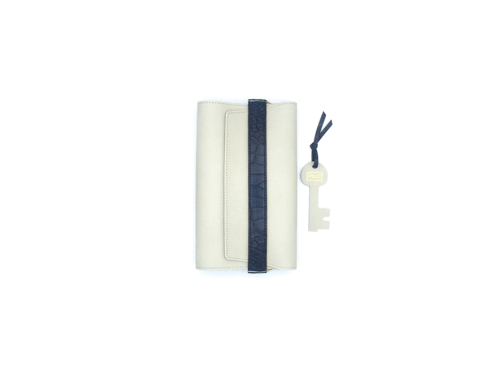 組み合わせたのはウロコ模様が美しく堅牢なアイリスブルーのクロコダイル革。